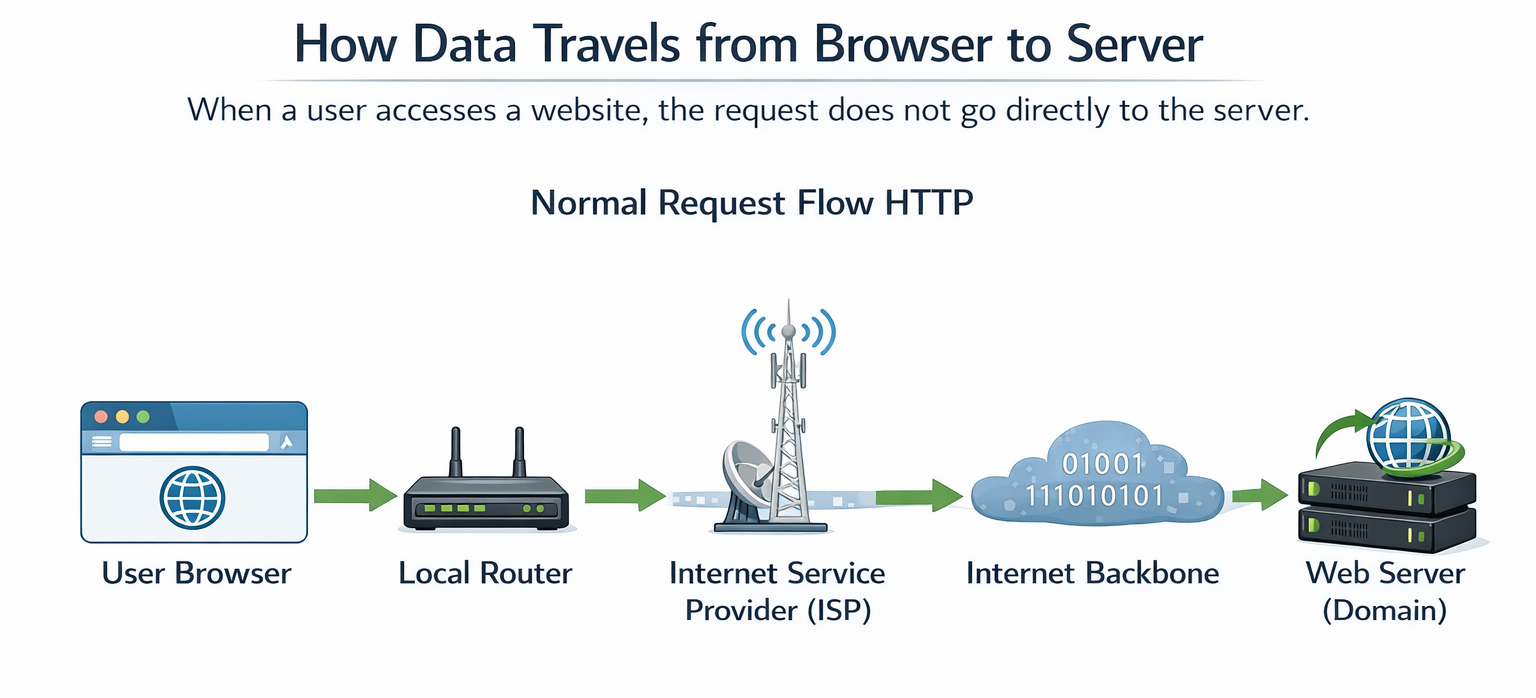 User Browser -—> Local Router -—> Internet Service Provider(ISP) -—> Internet Backbone -—> Web Server